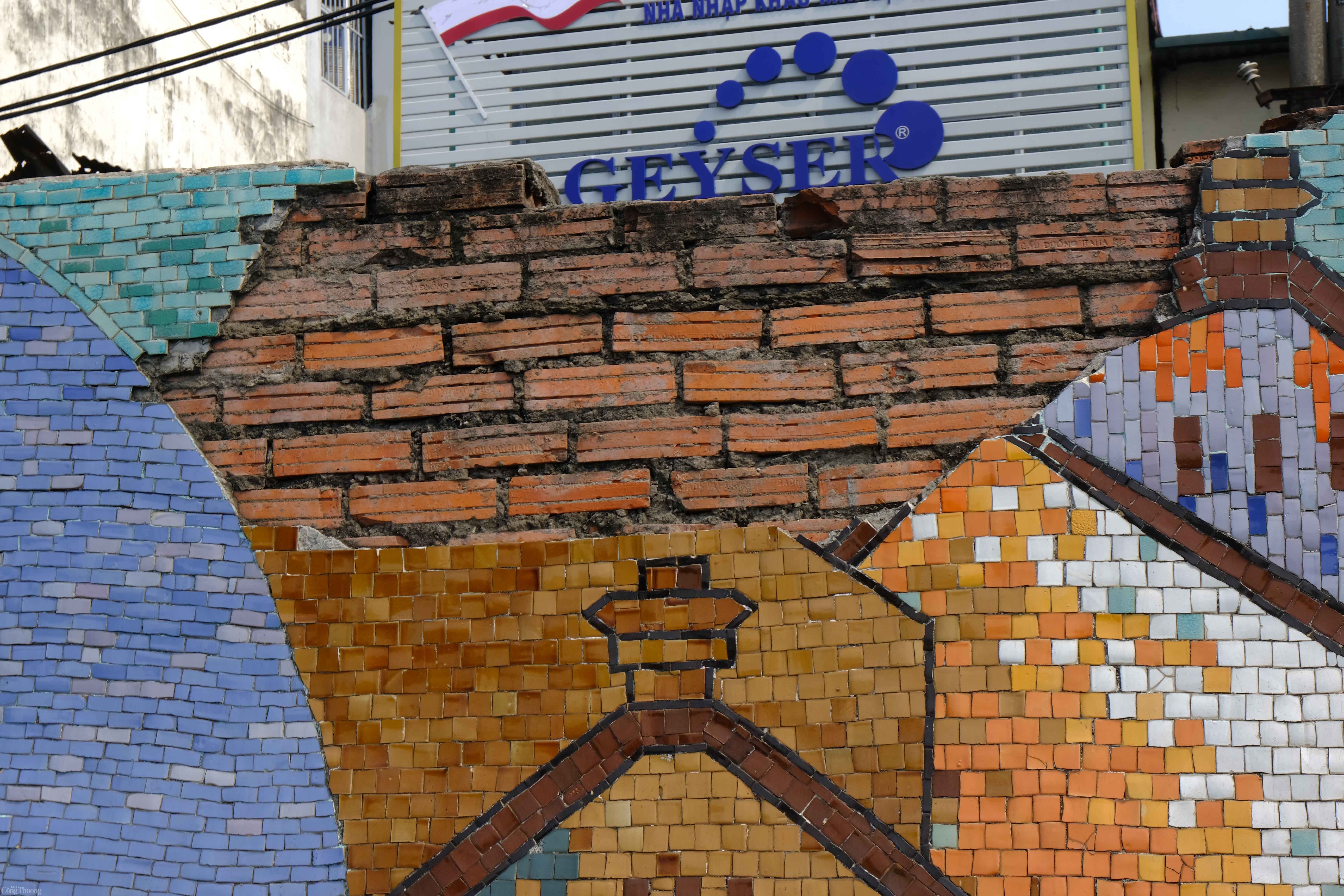 | Một mảng tường bị "lột sạch" toàn bộ phần gốm, để lộ bức tường gạch nham nhở. Ảnh: Trần Đình |