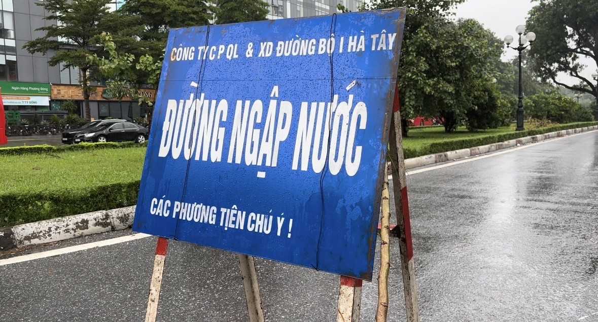 | Biển cảnh báo đường ngập nước được đặt tại Khu đô thị Văn Quán (Hà Đông, Hà Nội) - Ảnh: Hán Hiển |
