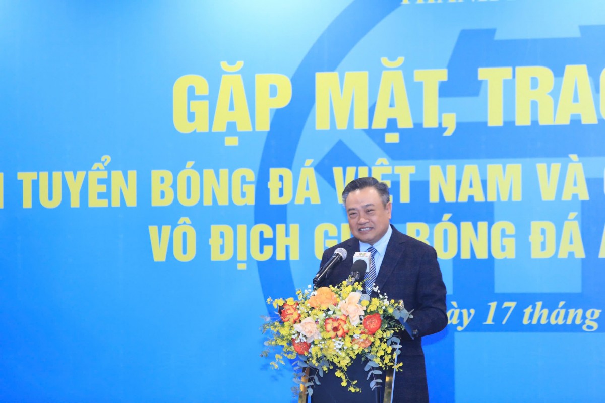 Tại buổi gặp mặt, Chủ tịch UBND TP. Hà Nội Trần Sỹ Thanh chúc mừng thành tích của Đội tuyển Quốc gia Việt Nam tại Giải bóng đá ASEAN Cup 2024 với chức vô địch lần thứ ba, cũng là chức vô địch đầy ý nghĩa, là món quà tặng người hâm mộ cả nước trong dịp đầu năm mới 2025 này.
