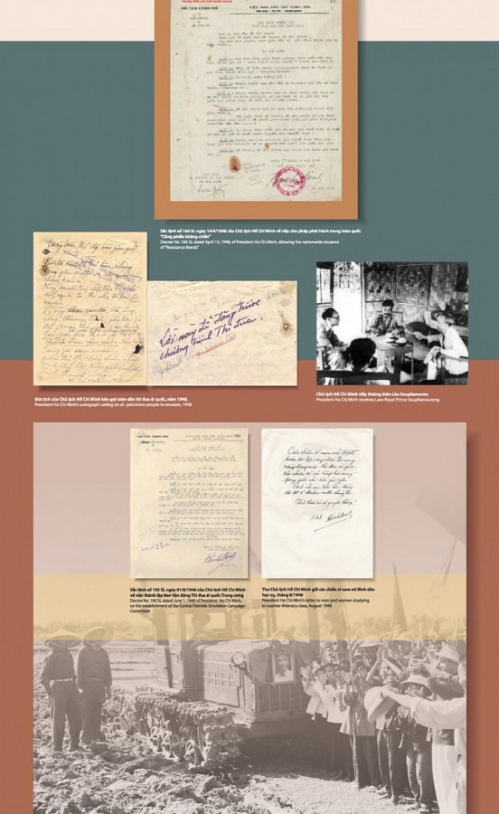 Nhiều Sắc lệnh có bút tích viết tay hoặc chữ ký của Chủ tịch Hồ Chí Minh là minh chứng về vai trò lãnh đạo tài tình, sáng suốt của Chủ tịch Hồ Chí Minh trong những năm đầu xây dựng chính quyền nhà nước non trẻ, trong những năm kháng chiến bảo vệ độc lập dân tộc, thể hiện tư tưởng đại đoàn kết dân tộc của Chủ tịch Hồ Chí Minh như: Lời kêu gọi toàn quốc kháng chiến của Chủ tịch Hồ Chí Minh ngày 19/12/1946, Bút tích của Chủ tịch Hồ Chí Minh kêu gọi toàn dân thi đua ái quốc năm 1948… Các văn bản này hiện đang được bảo quản và lưu trữ tại Trung tâm Lưu trữ quốc gia III, Cục Văn thư và Lưu trữ nhà nước.