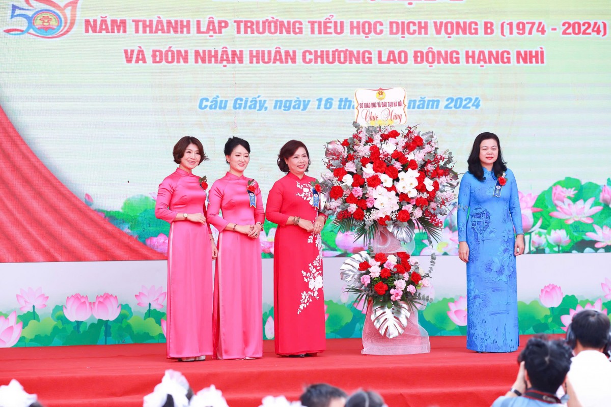 "Việc đón nhận Huân chương Lao động hạng Nhì ngày hôm nay, một lần nữa đánh dấu mốc son trong sự nghiệp trồng người của nhà trường. Trường Tiểu học Dịch Vọng B là một điểm sáng trong hệ thống 26 trường tiểu học trên địa bàn quận", bà Hoa biểu dương.