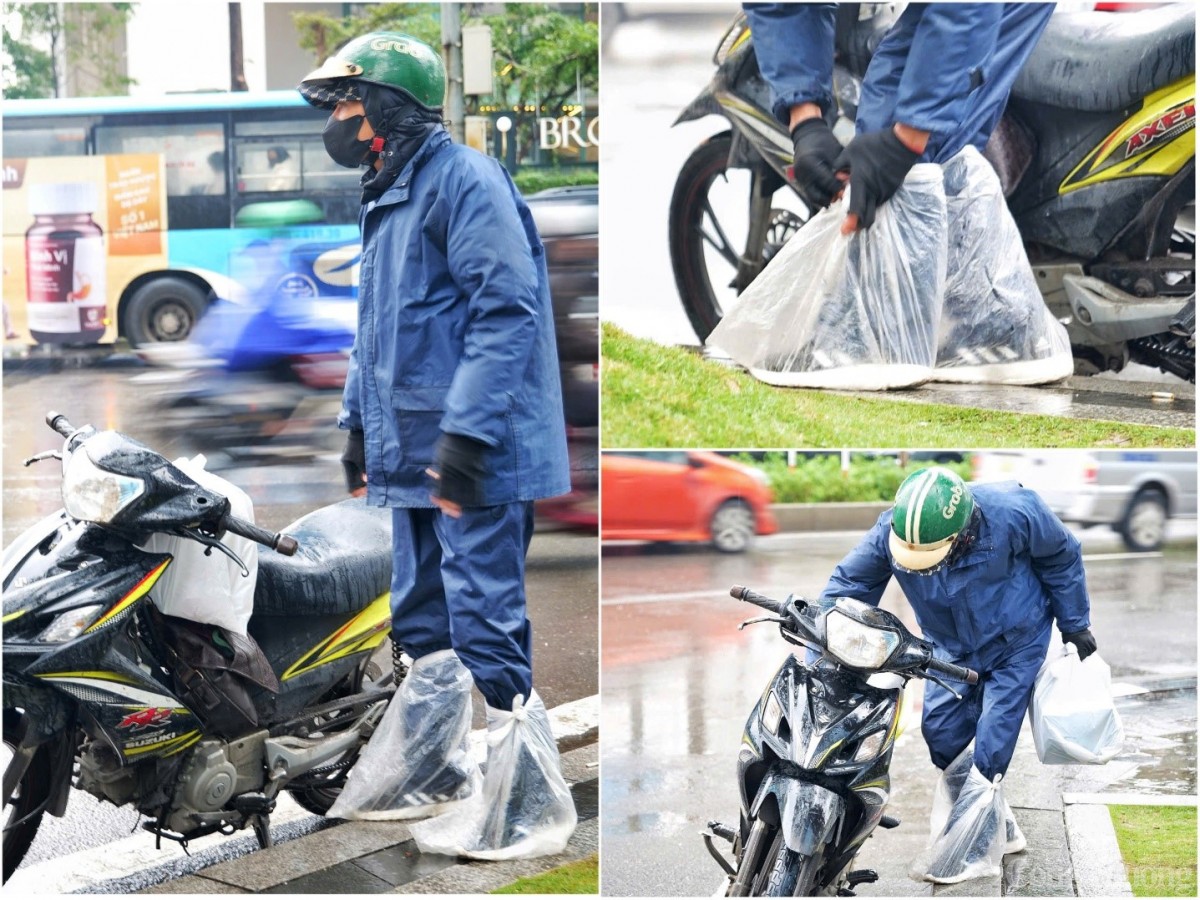 Muôn kiểu chống rét từ các bác tài xế, mặc 2 lớp áo mưa đến buộc kín túi bóng ở chân để tránh ngấm lạnh. |