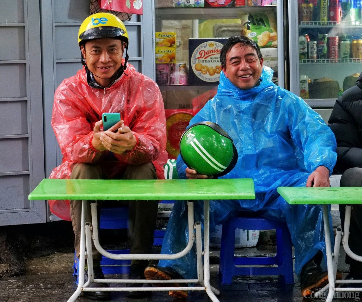 Theo ghi nhận của phóng viên Báo Công Thương, chiều tối 25/2, nhiệt độ tại Hà Nội giảm xuống 15 độ C. Do nhiệt độ xuống thấp, nhiều tài xế bị cóng tay, không thể điều khiển phương tiện nên tắt app nghỉ sớm, một số người tranh thủ nghỉ chân ở những nơi có mái che hoặc trong quán nước ven đường đợi "nổ cuốc" hoặc có đơn hàng là lại lên đường.