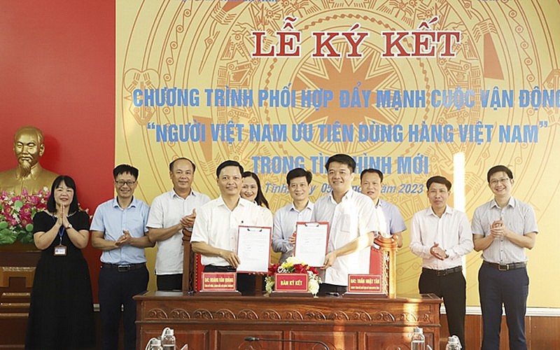 | Mặt trận Tổ quốc tỉnh Hà Tĩnh và Sở Công Thương ký kết các nội dung phối hợp đẩy mạnh Cuộc vận động “Người Việt Nam ưu tiên dùng hàng Việt Nam” trong tình hình mới (Ảnh: Lễ ký hết tháng 5/2023) |