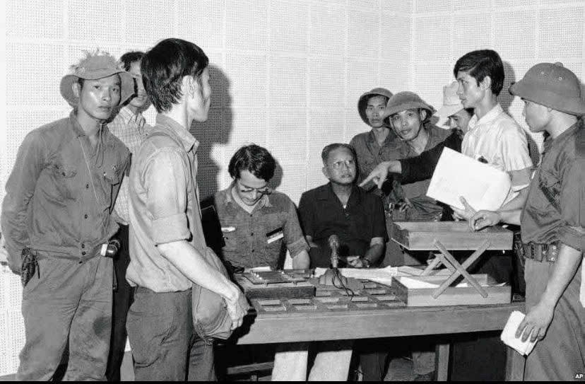 | Ông Nguyễn Hữu Thái (mặc áo trắng bên phải, đang cầm tập giấy) tại buổi ghi âm lời tuyên bố đầu hàng của tổng thống chính quyền Sài Gòn Dương Văn Minh (đeo kính, mặc áo đen đang nhìn lên). Ảnh tư liệu. |