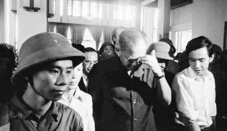 | Chiến sĩ Nguyễn Huy Hoàng (ngoài cùng bên trái) cùng đồng đội áp giải tổng thống chính quyền Sài Gòn Dương Văn Minh (giữa) và thủ tướng Vũ Văn Mẫu (người đeo kính phía sau) ra đài phát thanh Sài Gòn đọc tuyên bố đầu hàng quân giải phóng. |