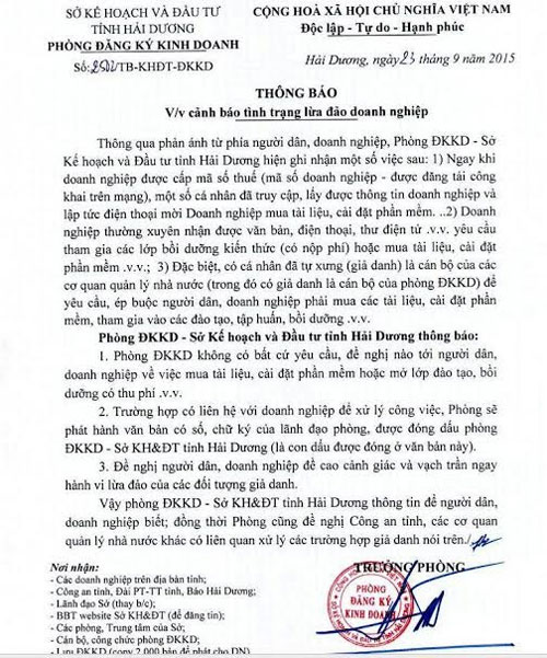 Ông Lê Xuân Hiền - Trưởng phòng Đăng ký kinh doanh - Sở KH&ĐT tỉnh Hải Dương khẳng định: “Phòng Đăng ký kinh doanh không có bất cứ yêu cầu, đề nghị nào tới người dân, doanh nghiệp về việc mua tài liệu, cài đặt phần mềm hoặc mở lớp đào tạo, bồi dưỡng có thu phí. Các trường hợp có liên hệ với doanh nghiệp để xử lý công việc, phòng sẽ phát hành văn bản có số, chữ kí của lãnh đạo phòng, được đóng dấu Phòng Đăng ký kinh doanh - Sở KH&ĐT tỉnh Hải Dương.
