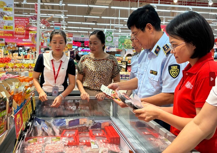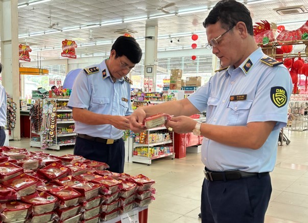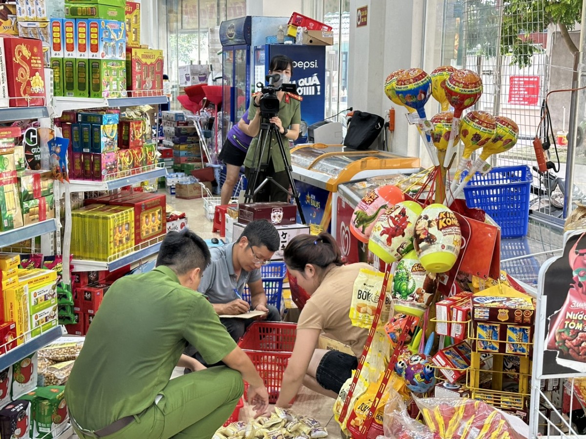 | Kiểm tra các sản phẩm bánh kẹo, thực phẩm tươi sống. Ảnh: Cục QLTT Hải Dương |