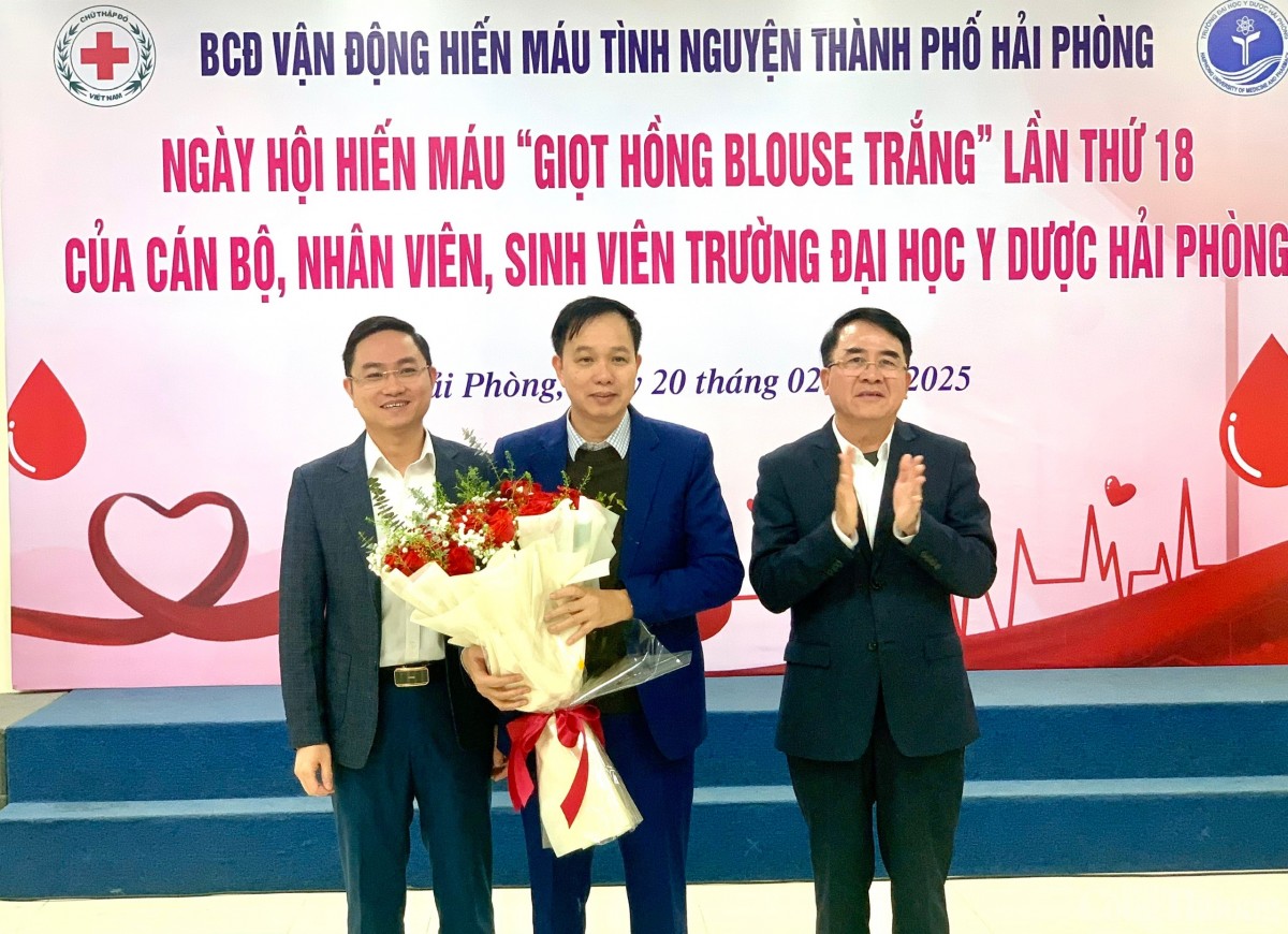 | Đại diện lãnh đạo Hội Chữ thập đỏ TP. Hải Phòng tặng hoa các tình nguyện viên Trường Đại học Y Dược Hải Phòng tham gia Ngày hội hiến máu tình nguyện “Giọt hồng Blouse trắng” lần thứ 18 |