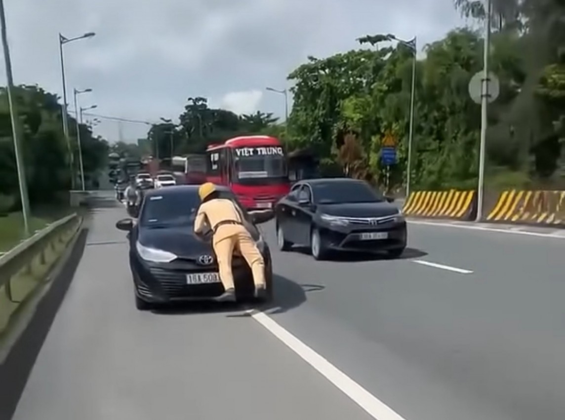 Tổ công tác ra tín hiệu dừng phương tiện để kiểm tra. Tuy nhiên, lái xe ôtô này không chấp hành hiệu lệnh mà cho xe tiến thẳng khiến 1 CSGT phải bám vào cần gạt mưa, nằm trên nắp capô.
