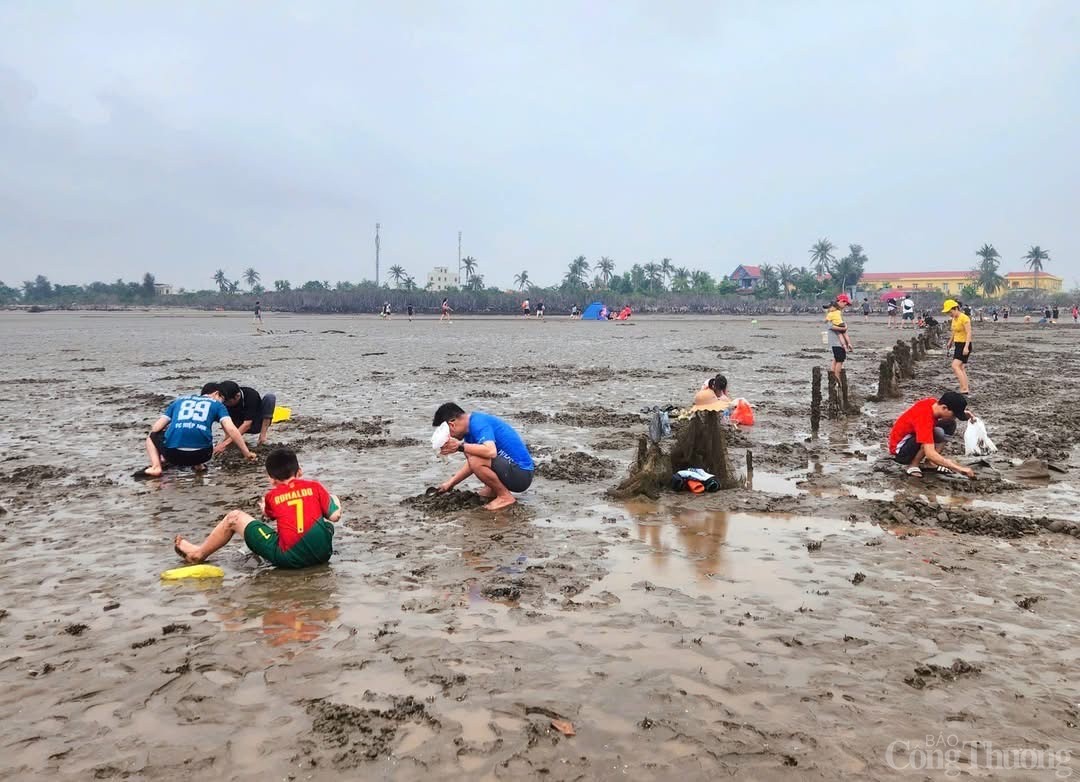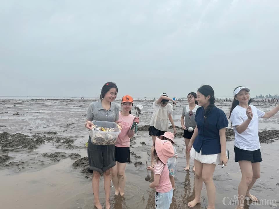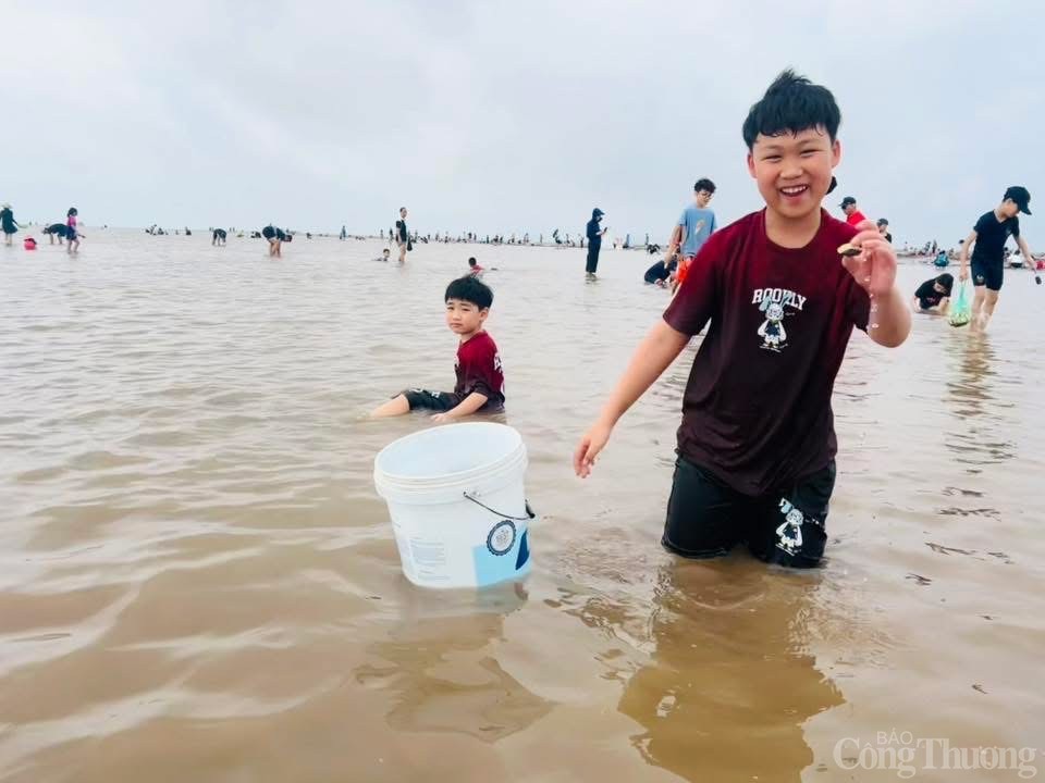 | Trẻ em háo hức khi được bố mẹ cho tham gia trải nghiệm bắt ngao tại bãi biển Hoàng Châu |