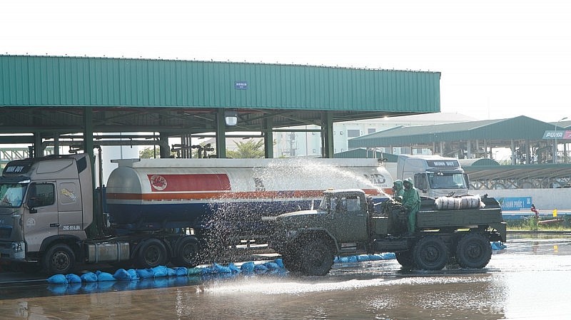 | Xe tiêu độc của Quân khu cơ động ra hiện trường tiến hành tiêu độc đường và tiêu độc công trình, nhà xưởng |