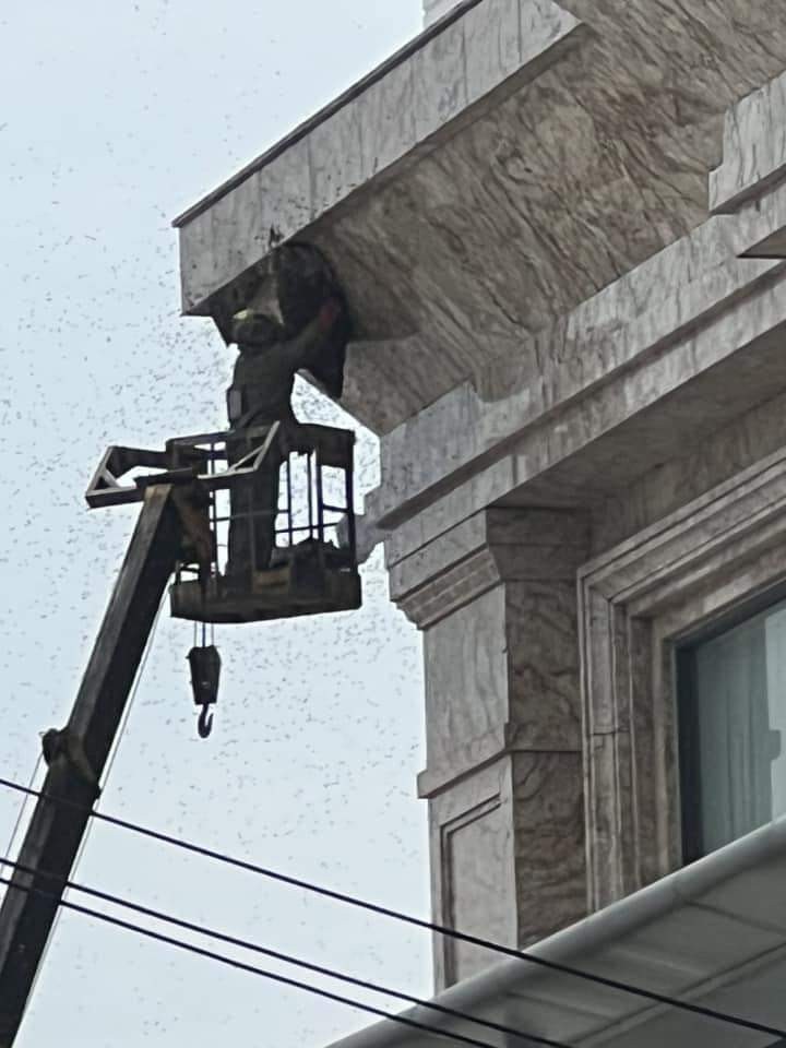 | Cảnh bắt ong tại một khách sạn tại Hải Phòng làm nhiều người đi đường bị đốt gây xôn xao. (Ảnh: MXH) |
