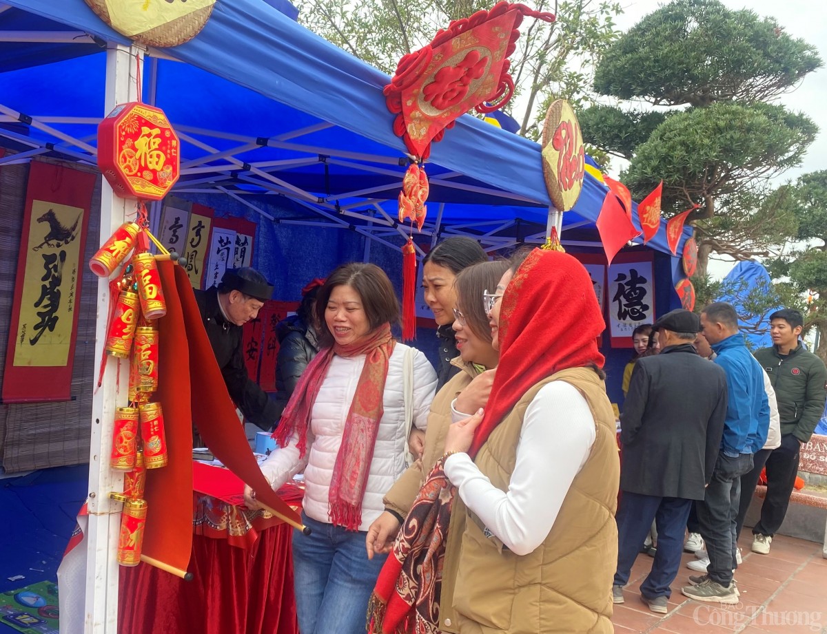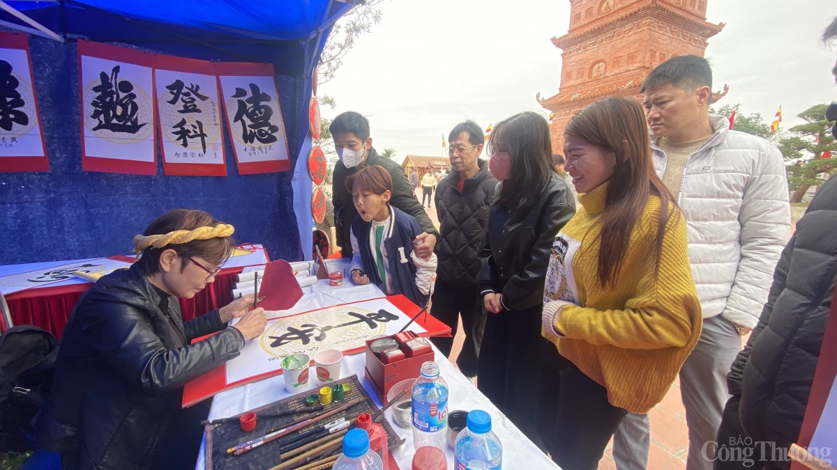 | Đông đảo người dân và du khách tham quan, xin chữ thư pháp tại tháp Tường Long (quận Đồ Sơn) mong một năm mới mạnh khỏe, an lành, thành công và hạnh phúc. |