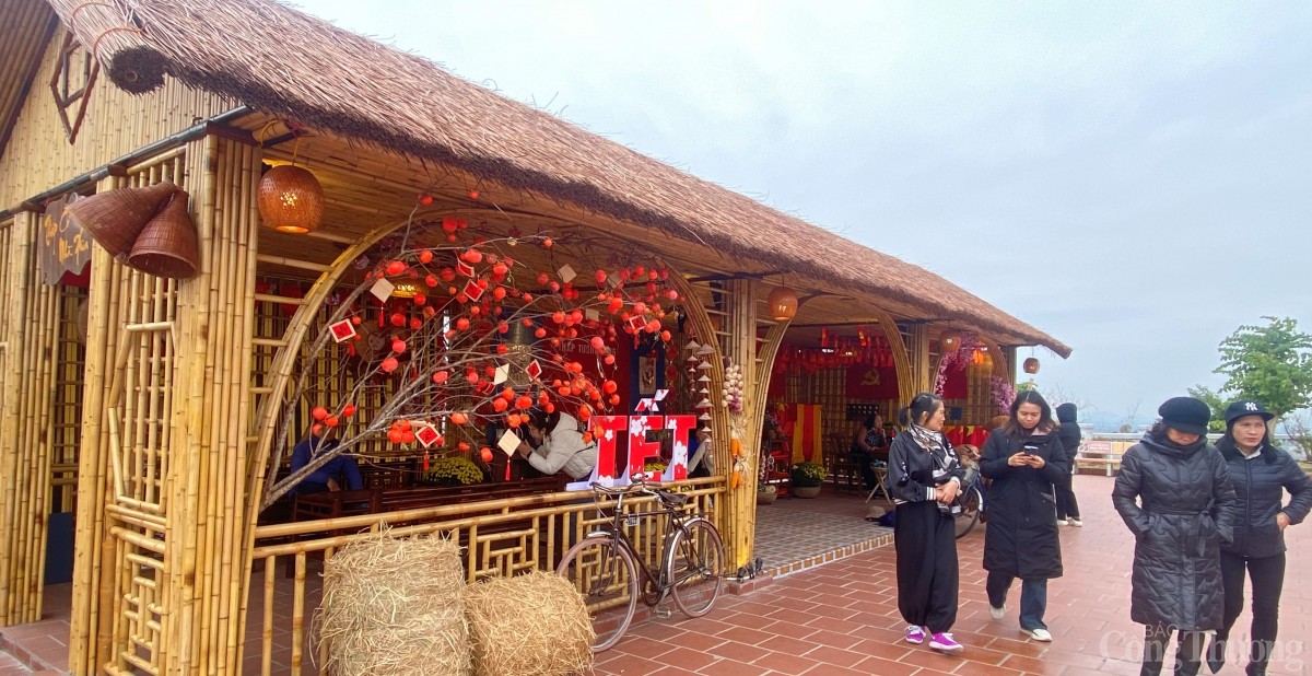 | Khu không giam Tết xưa tại khuôn viên tháp Tường Long được đông đảo du khách tham quan và chụp những tấm ảnh làm kỷ niệm trong chuyến du xuân. |