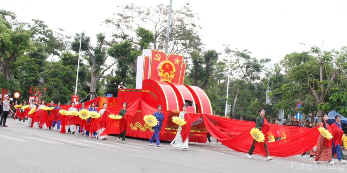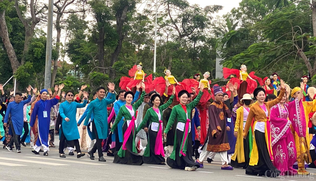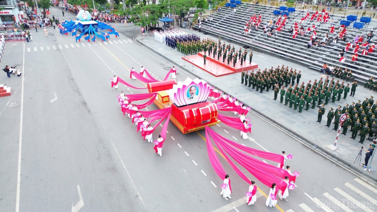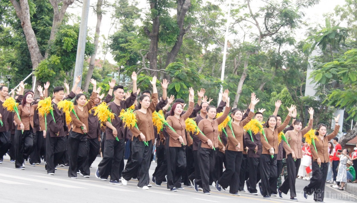 Các khối tham gia diễu hành theo tuyến Trần Hưng Đạo qua Quảng trường Nhà hát thành phố Quang Trung, phía trước tượng đài Nữ tướng Lê Chân - Nguyễn Đức Cảnh - Trần Phú.