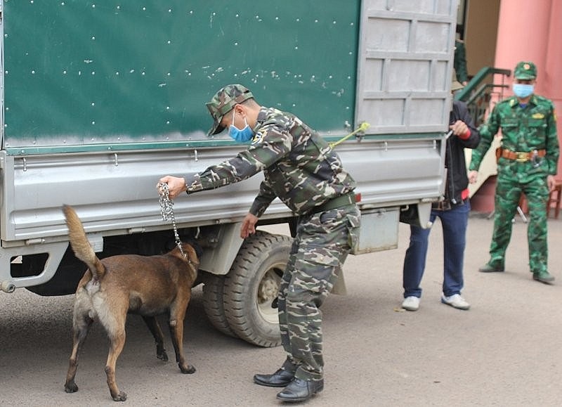 Cán bộ Chi cục Hải quan Cửa khẩu quốc tế Na Mèo sử dụng chó nghiệp vụ kiểm tra, ngăn chặn hàng cấm lọt qua cửa khẩu. Ảnh: Hải Quan Thanh Hóa |