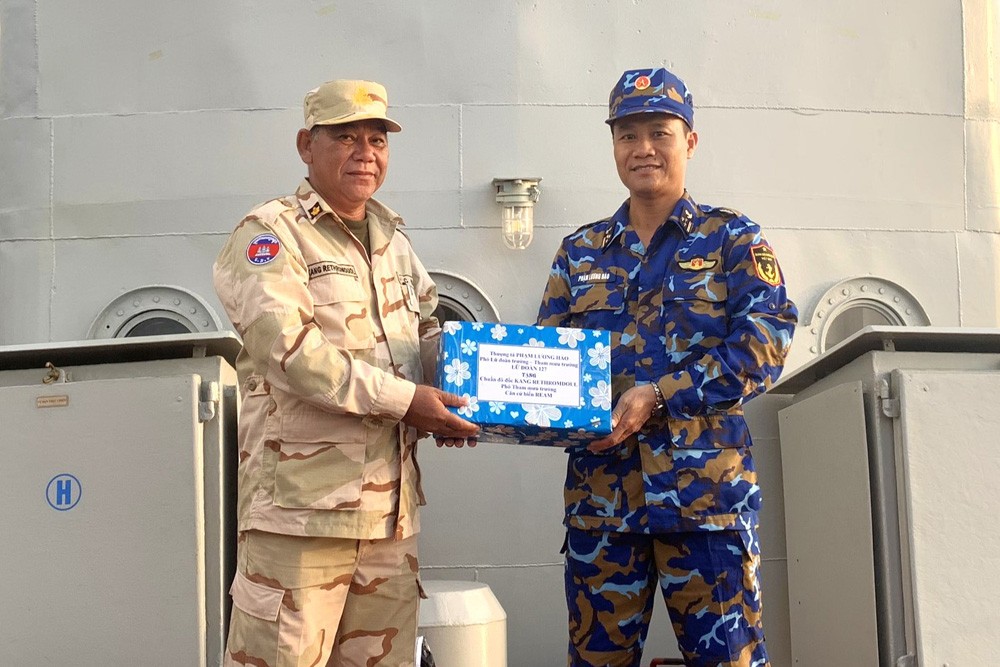 Chỉ huy tàu Hải quân Việt Nam tặng quà chỉ huy tàu Hải quân Hoàng gia Campuchia |