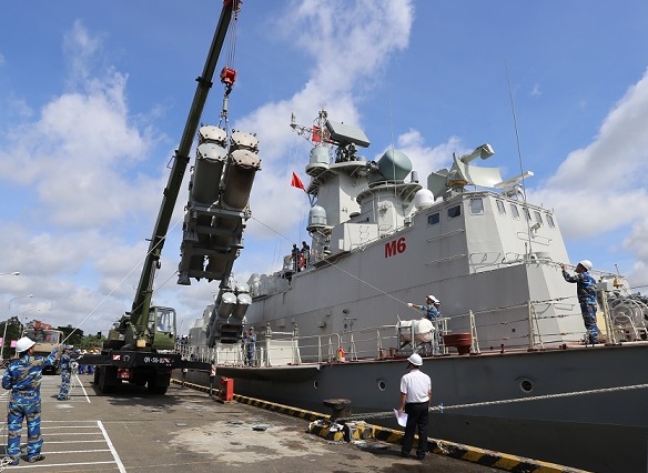| Cẩu tên lửa lên tàu M6. Ảnh Báo HQVN |
