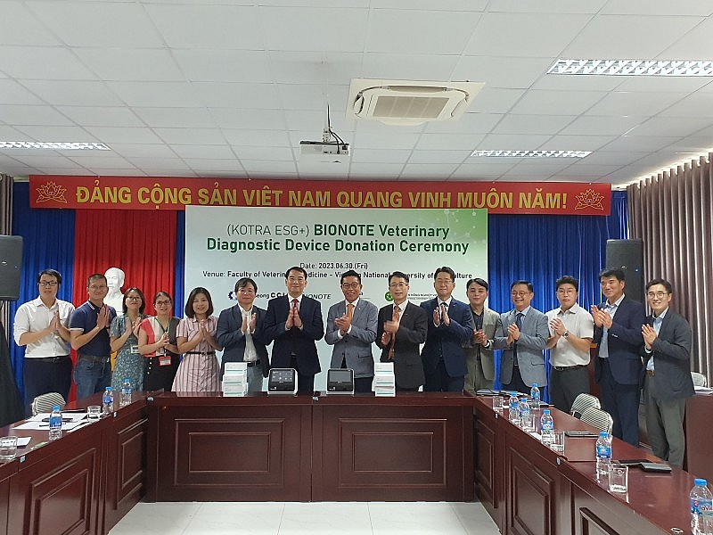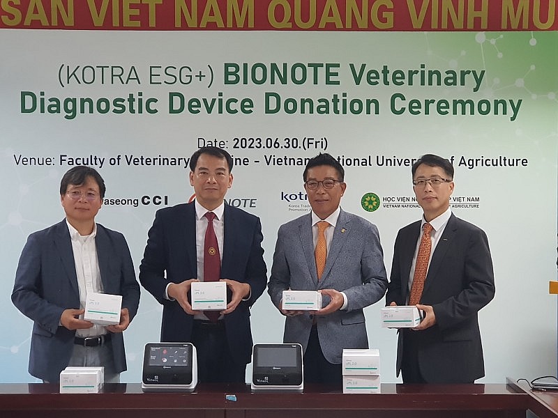 Thông tin từ Cơ quan Xúc tiến thương mại và đầu tư Hàn Quốc tại Hà Nội (KOTRA Hanoi) trực thuộc Đại sứ quán Hàn Quốc tại Việt Nam cho biết, ngày 30/6, Chủ tịch Phòng Thương mại và Công nghiệp Hwaseong (HwaseongCCI) - ông Park Seong-kwon, Giám đốc Công ty Bionote Hàn Quốc - ông Cho Byung-ki, Chủ tịch Cơ quan Xúc tiến thương mại và đầu tư Hàn Quốc (KOTRA) khu vực Đông Nam Á và châu Đại Dương - ông Lee Jong Seob đã trao tặng Khoa Thú y, Học viện Nông nghiệp Việt Nam 2 máy xét nghiệm miễn dịch huỳnh quang Vcheck-V200 và 300 bộ xét nghiệm chẩn đoán viêm tụy (Vcheck F cPL) để giúp cải thiện phúc lợi động vật tại địa phương.