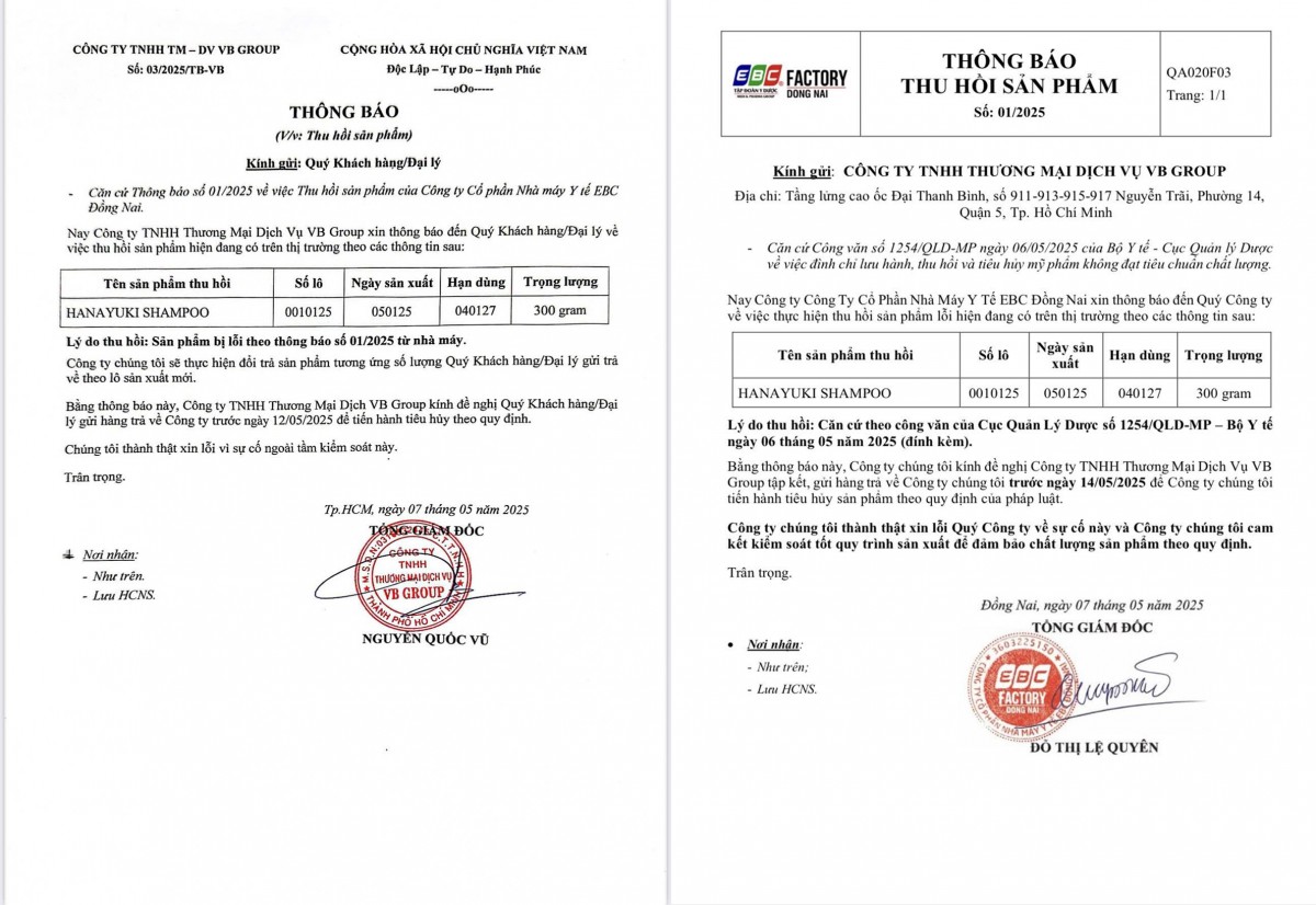Trước đó, Cục Quản lý Dược, Bộ Y tế đã ban hành Công văn số 1254/QLD-MP ngày 6/5/2025 yêu cầu đình chỉ lưu hành, thu hồi và tiêu hủy sản phẩm Hanayuki Shampoo -Chai 300 gam, thuộc lô 0010125, ngày sản xuất 05/01/2025, hạn dùng 04/01/2027. Theo kết quả kiểm nghiệm của Viện Kiểm nghiệm thuốc TP.HCM (Phiếu số 0023/VKN-KTMP2025 ngày 29/4/2025), mẫu sản phẩm lấy tại Công ty cổ phần nhà máy y tế EBC Đồng Nai không đạt yêu cầu chất lượng do vi phạm chỉ tiêu vi sinh vật và phát hiện chứa 2-Phenoxyethanol, một thành phần không có trong công thức đã được cấp số tiếp nhận Phiếu công bố sản phẩm mỹ phẩm. Theo dữ liệu từ Cổng thông tin quốc gia về đăng ký doanh nghiệp, Công ty cổ phần nhà máy y tế EBC Đồng Nai trước đây có tên là Công ty TNHH EBC Group.