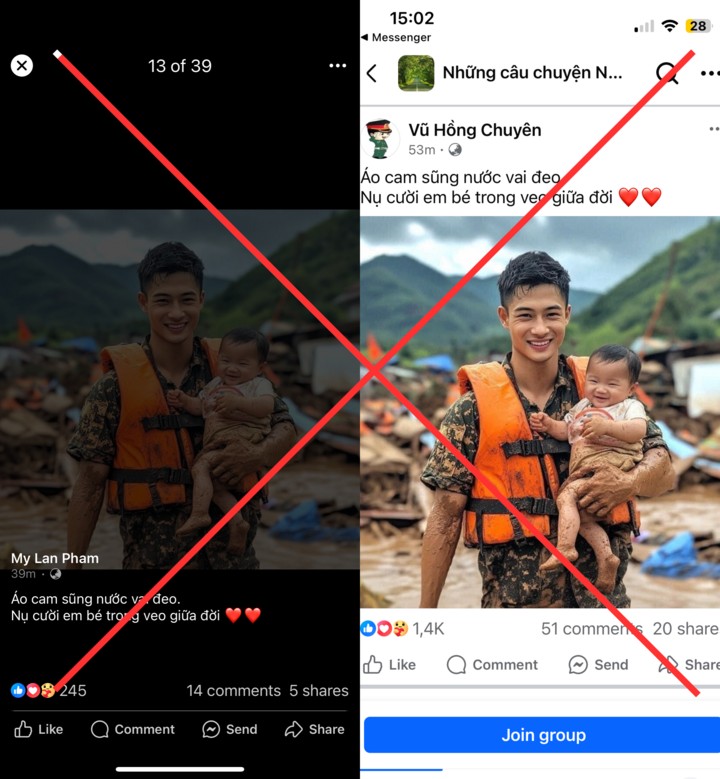 Mới đây, nhằm lợi dụng hoàn cảnh bão lũ để kiếm tương tác, MXH đã xuất hiện bức ảnh một người thanh niên mặc trang phục rằn ri kèm áo phao, bế một em nhỏ. Đằng sau hai người là khung cảnh tan hoang, nhà cửa bị tàn phá do bão lũ ở một vùng miền núi.