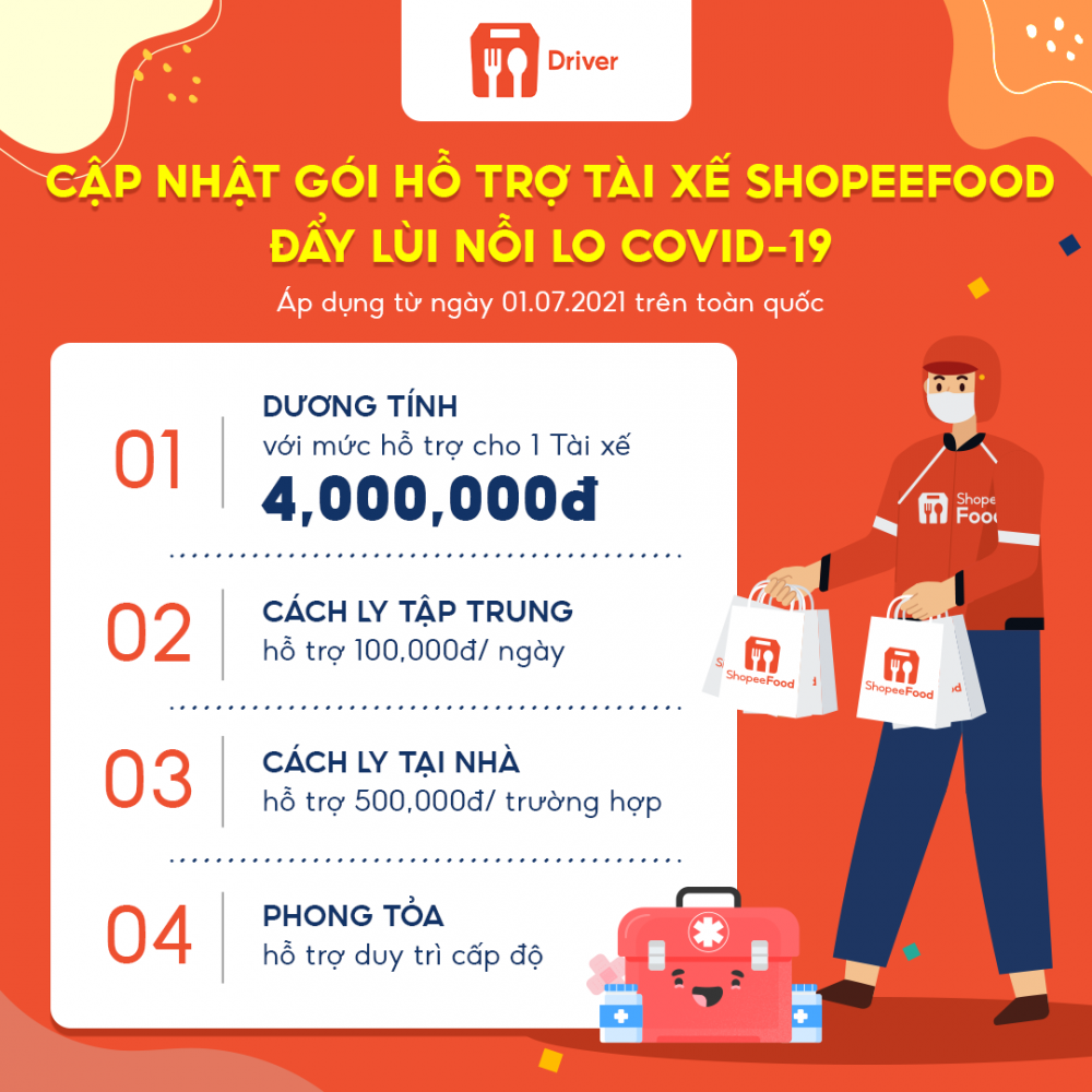 Theo đó, từ đầu năm nay, ShopeeFood đã duy trì các chương trình hỗ trợ cho hàng chục nghìn bác tài gặp khó khăn trong giai đoạn dịch Covid-19. Nổi bật có gói “Hỗ trợ tài xế ShopeeFood - Không còn nỗi lo COVID-19” với mức hỗ trợ lên tới 4,000,000 VNĐ/trường hợp cho tài xế không may dương tính trong quá trình giao hàng và có xác nhận từ cơ quan y tế. Bên cạnh đó, từ 26.8, ShopeeFood đã bổ sung thêm chính sách mới được mở rộng điều kiện không yêu cầu bị ảnh hưởng trong quá trình giao hàng. Theo đó, tài xế sẽ được hỗ trợ từ 1,000,000 đến 2,000,000 VNĐ/trường hợp. Tài xế cũng sẽ được “Hỗ trợ khoản phạt vi phạm hành chính” ở mức hỗ trợ tối đa 2,000,000 VNĐ/Tài xế đang hoạt động trong thời gian giãn cách đã thực hiện theo đúng hướng dẫn của ShopeeFood và các quy định về phòng chống dịch do các Cơ quan chức năng ban hành.