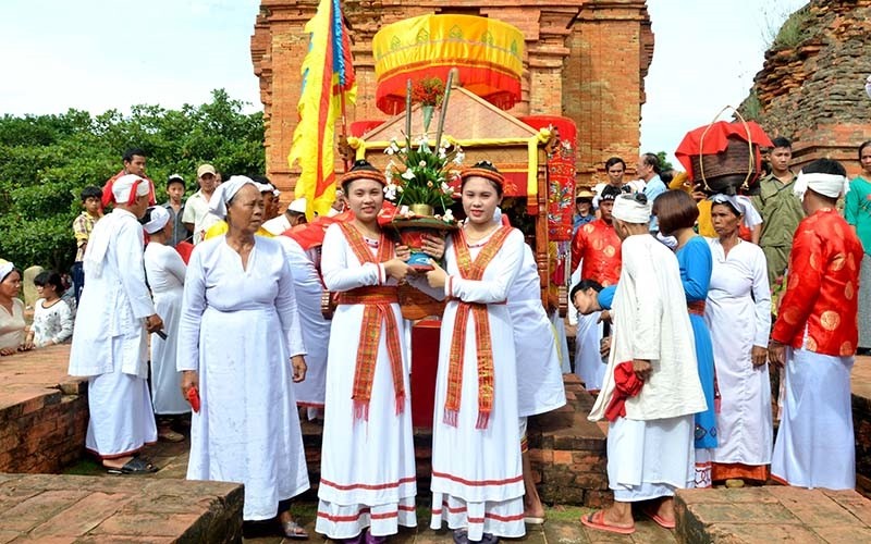 Người dân tộc Chăm dâng lễ lên Tháp theo phong tục cổ truyền. (Ảnh tư liệu)