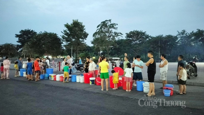 Ghi nhận của phóng viên Báo Công Thương vào đêm ngày 22/10, hàng ngàn cư dân tại Khu đô thị Thanh Hà (xã Cự Khê, huyện Thanh Oai) vẫn phải mang xô, chậu ra xếp hàng ở nội khu để xin nước sạch hỗ trợ.