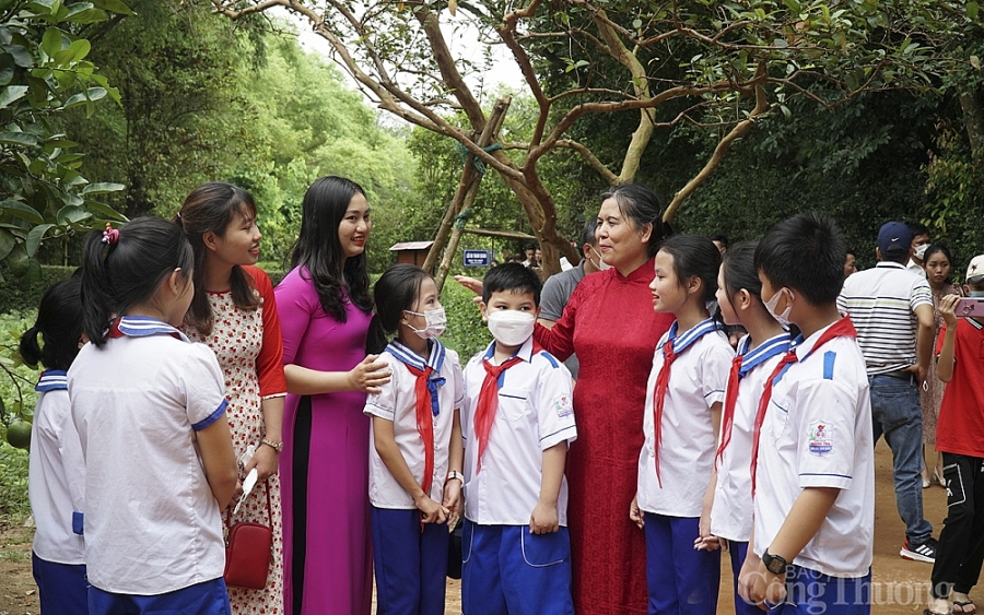 | Du khách vui vẻ gặp gỡ, trò chuyện với học sinh trên quê hương Bác. |