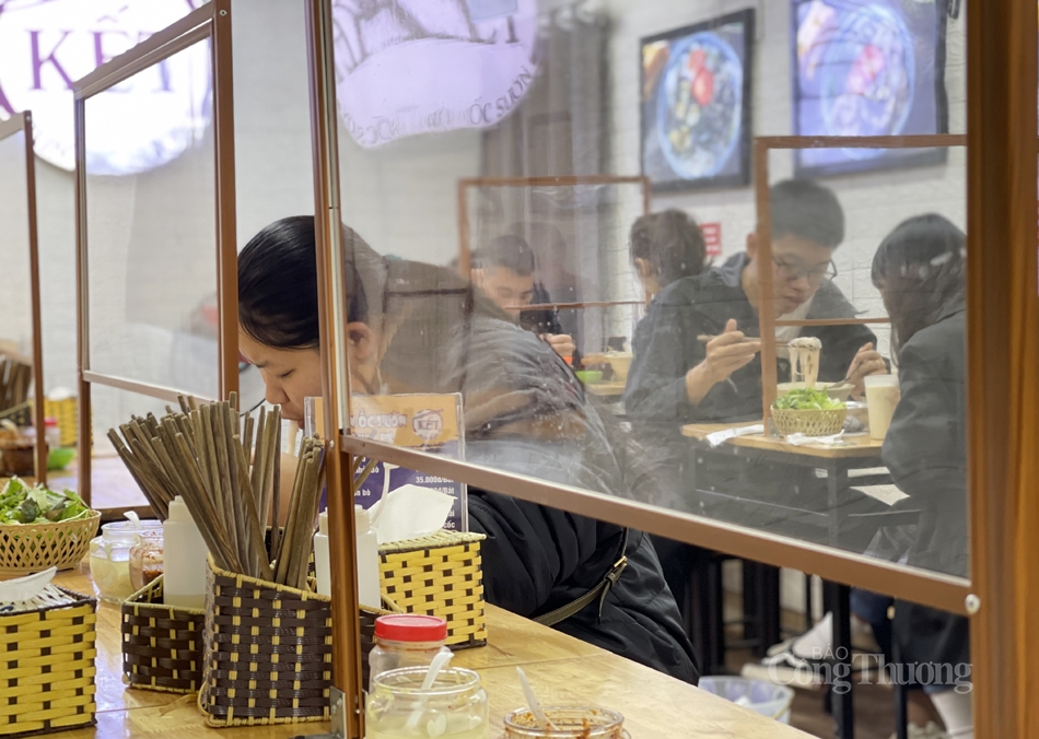 Thay vì bán mang về, giờ, khách được ăn tại chỗ. Nhiều quán đã chủ động lắp tấm chắn, đảm bảo điều kiện kinh doanh trong mùa dịch.