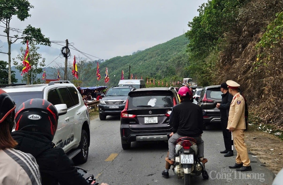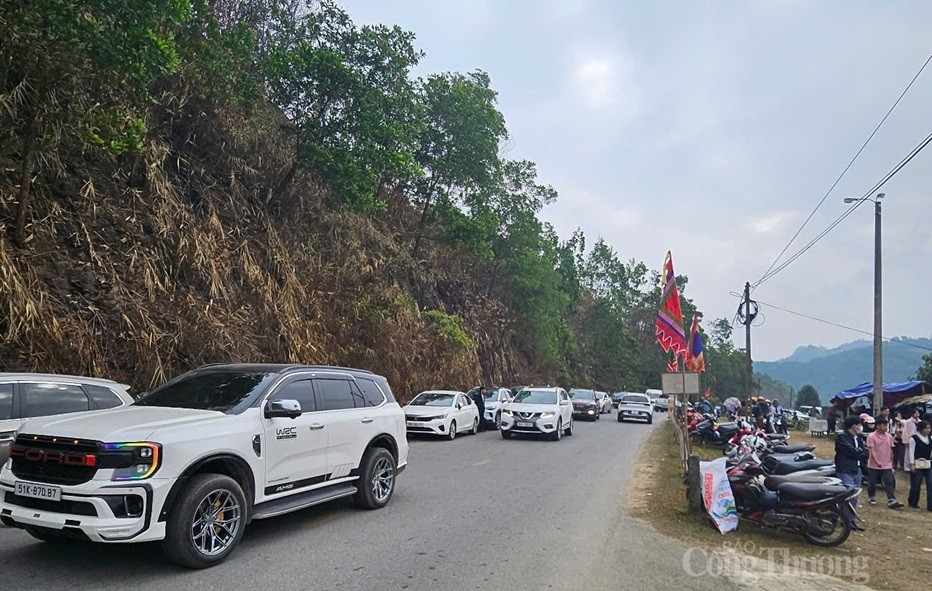 Dòng xe nối đuôi nhau từ đền Cô Thác Mạ vào đền Cửa Đạt. Ảnh: Hoàng Minh