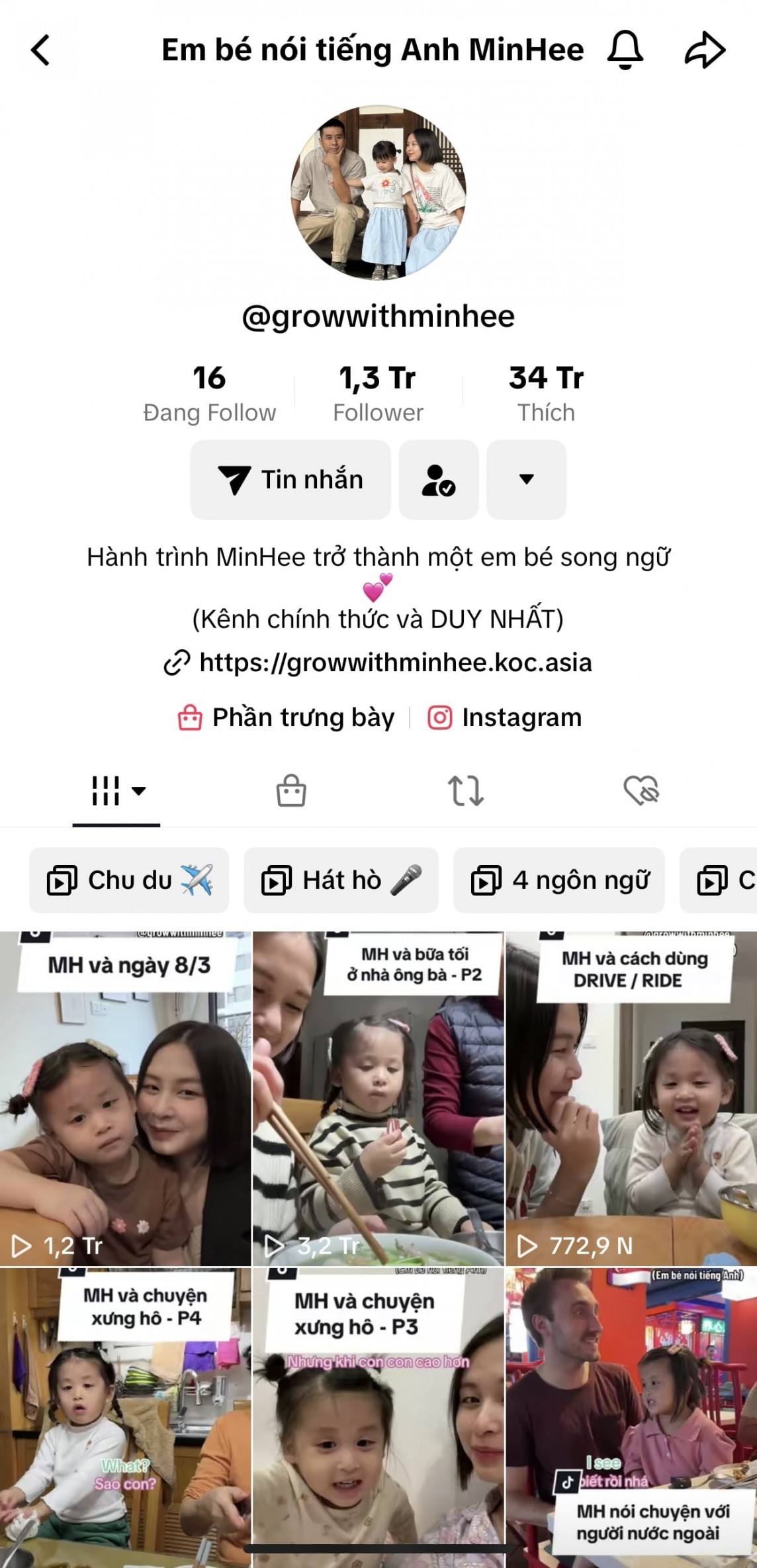Các video trên kênh TikTok với lượng người theo dõi lên đến 1,3 triệu người của MinHee đã ghi lại những khoảnh khắc đời thường của bé, như trò chuyện với bố mẹ, học tập, vui chơi, đi du lịch...