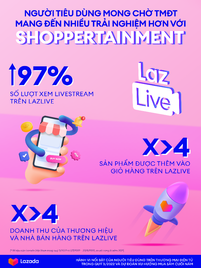 Tại Lazada, kênh livestream LazLive là một trong những kênh mua sắm kết hợp giải trí then chốt dành cho người dùng cũng như hỗ trợ thương hiệu và nhà bán hàng kinh doanh hiệu quả. Theo đó, Lazada ghi nhận số lượt xem livestream trên LazLive vào quý 3 năm 2022 đã tăng 97% so với cùng kì năm 2021 nhờ vào những nội dung livestream thú vị, đặc sắc cũng như tính năng Nhìn thấy – Mua ngay (See Now Buy Now) ngày càng được tối ưu và cải tiến.