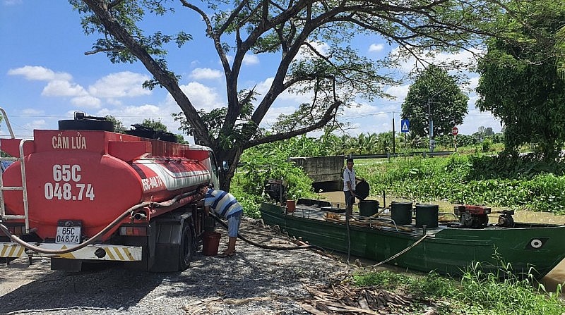 | Xe ô tô xitec biển kiểm soát 65C-048.74 đang thực hiện hành vi bơm nhiên liệu từ bồn chứa của phương tiện này xuống bồn chứa tàu không số đăng ký |