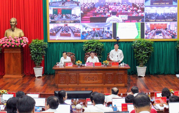 | Hội nghị trực tuyến sơ kết 3 tháng thực hiện Đề án số 09 của Ban Thường vụ Tỉnh ủy Hậu Giang vào ngày 12/4. (Ảnh: TS) |