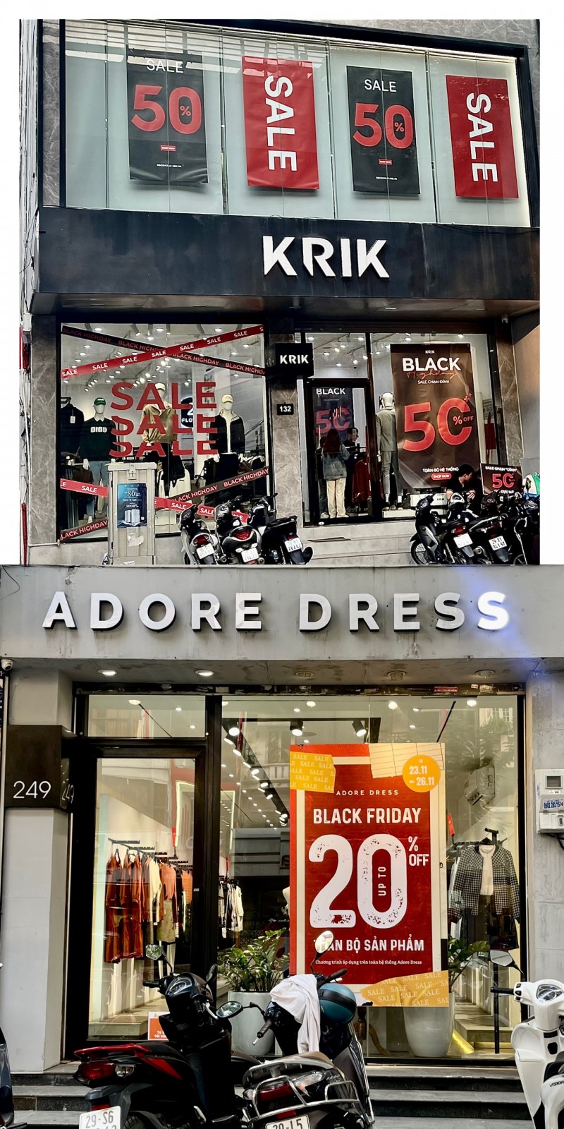 Trên tuyến phố thời trang nổi tiếng Cầu Giấy, các shop thời trang vẫn nổi bật với những biển hiệu quảng cáo "Black Friday sale" cùng vô vàn mức giá giảm sâu. |