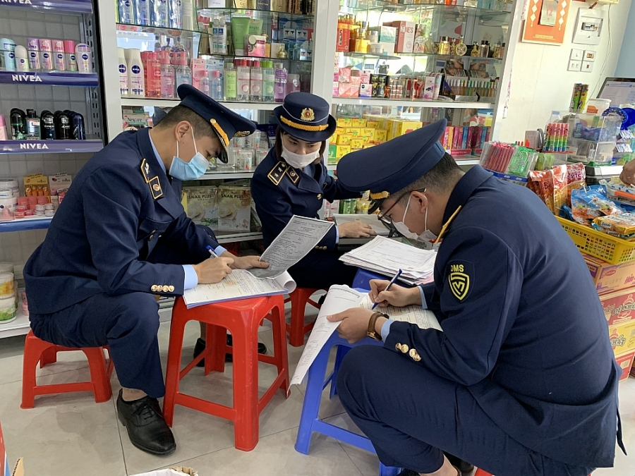 Các kiểm soát viên QLTT đang ngồi viết ấn chỉ trong một vụ kiểm tra |