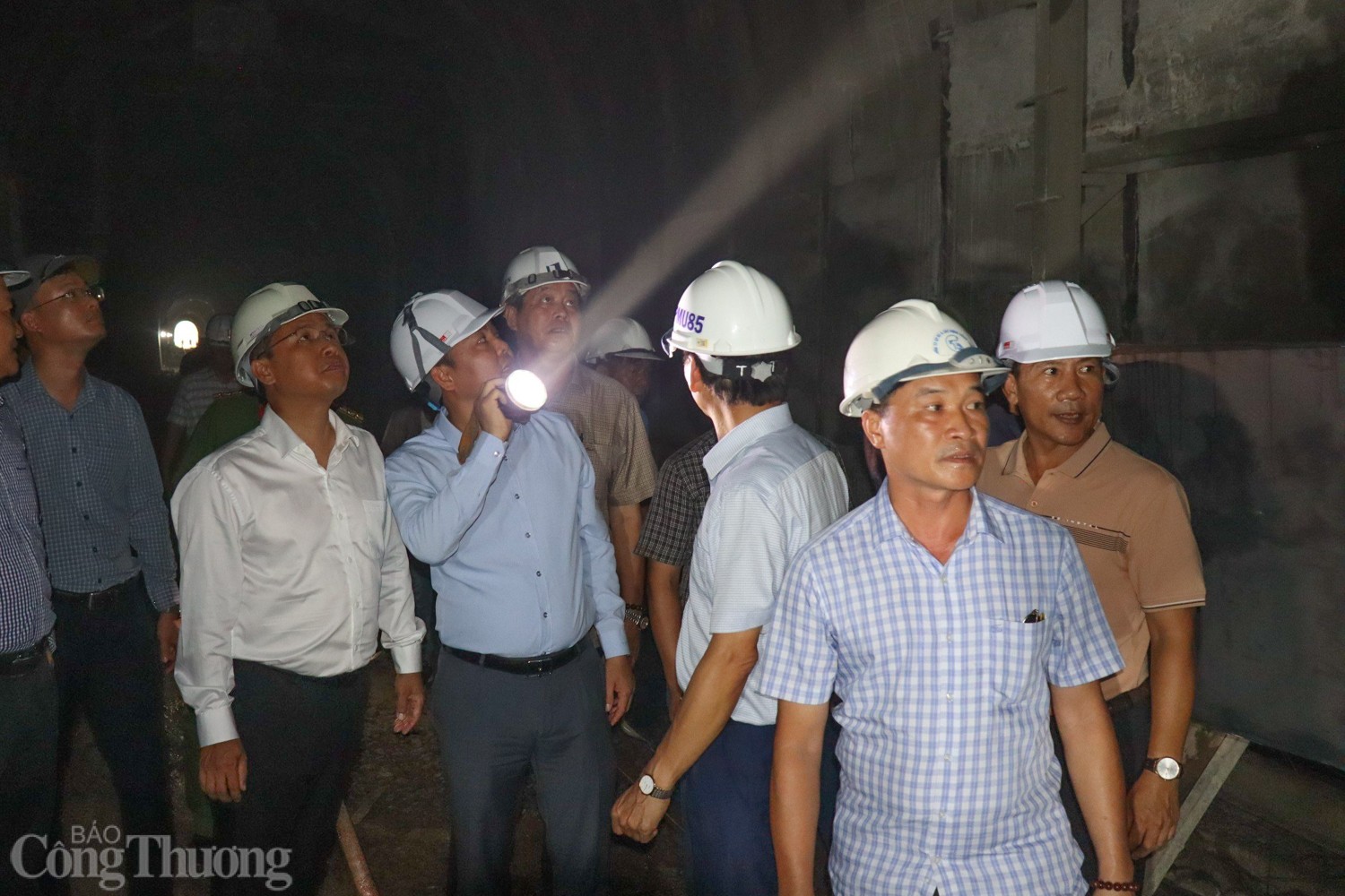 | Phó Chủ tịch UBND tỉnh Khánh Hoà Trần Hoà Nam (áo trắng, bìa trái) kiểm tra sự cố sạt lở hầm Bãi Gió, chiều 15/4. |