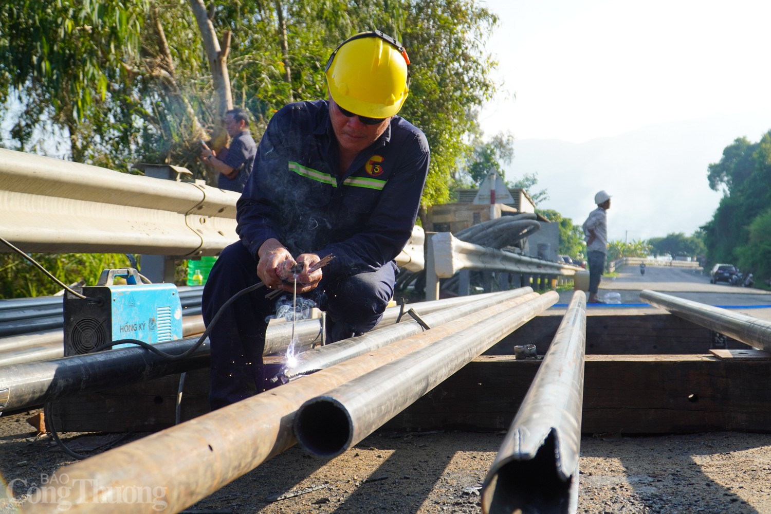 | Phóng viên Báo Công Thương ghi nhận tại sườn núi đèo Cả, nơi hàng chục công nhân đang tranh thủ thi công trong thời tiết nắng nóng, chiều 15/4. |