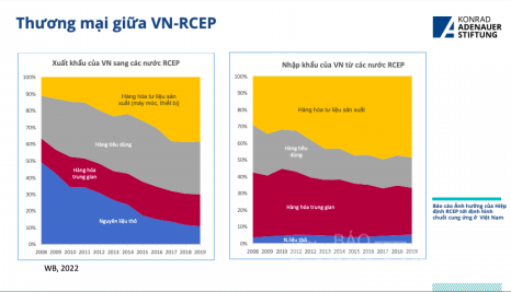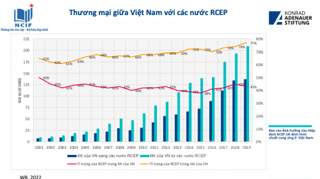 Nhận định này được làm rõ hơn tại bác cáo “Ảnh hướng của Hiệp định RCEP tới định hình chuỗi cung ứng ở Việt Nam” do NCIF và KAS. Báo cáo cho rằng, do các FTA đã ký trước đó giữa nhiều nước thành viên, một số nhóm sản phẩm như linh kiện điện tử, dệt may giữa các quốc gia trong RCEP đã có mức thuế rất thấp, nên tác động thương mại của RCEP không nhiều. Tuy nhiên, thuế với một số mặt hàng Việt Nam tham gia sâu vào chuỗi cung ứng như: Dệt may, ô tô, một số sản phẩm điện tử được cắt giảm và việc áp dụng quy tắc xuất xứ thống nhất trong RCEP sẽ giúp Việt Nam tham gia sâu hơn vào chuỗi cung ứng khu vực.