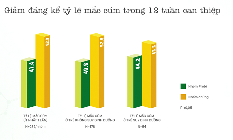 | Bảng kết quả: Giảm đáng kể tỷ lệ mắc cúm trong 12 tuần can thiệp (p<0,05) |