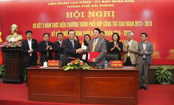 Tại hội nghị, đại diện lãnh đạo UBND TP. Hải Phòng và LĐLĐ thành phố đã tiếp tục ký kết Chương trình phối hợp giai đoạn 2016-2020, đặt nhiệm vụ phối hợp hiệu quả hơn nữa, tiếp tục triển khai bám sát những chỉ đạo của Trung ương và UBND thành phố trong các hoạt động liên quan đến quyền lợi, nghĩa vụ của công chức, viên chức, lao động và tổ chức công đoàn.