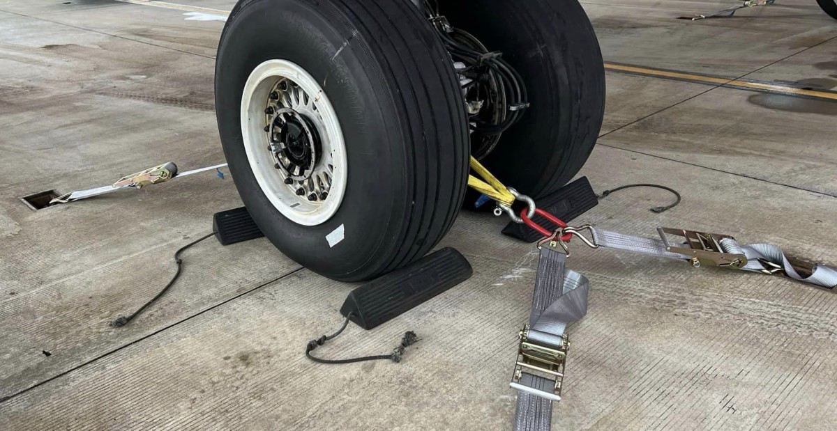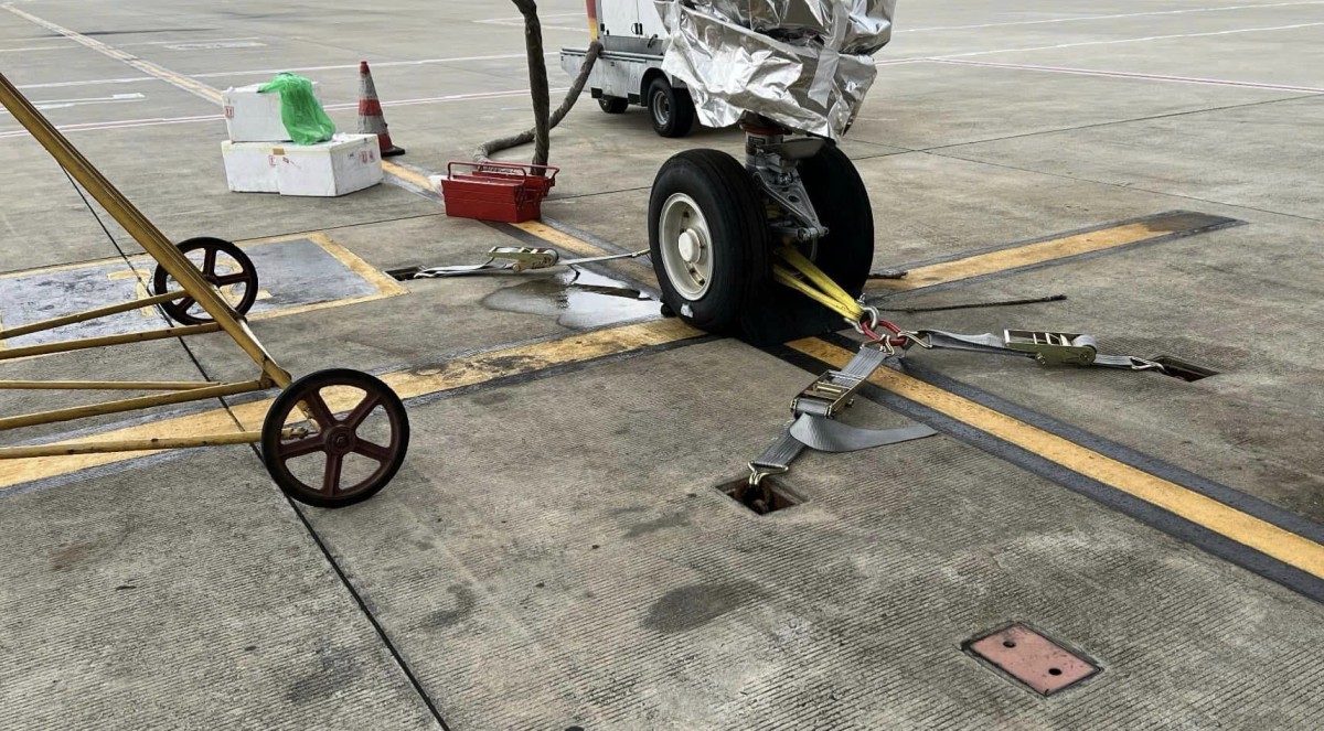 Cận cảnh công tác chằng néo tàu bay. Ảnh: NIA