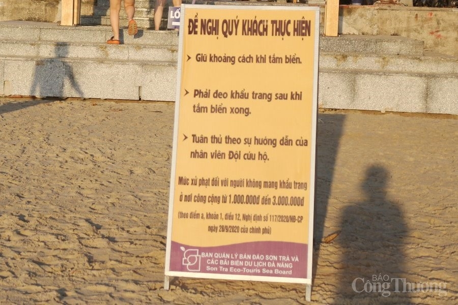 | Các bảng thông tin tuyên truyền, nhắc nhở người dân tuân thủ các quy định phòng chống dịch Covid - 19 được đặt tại khu vực bãi biển |