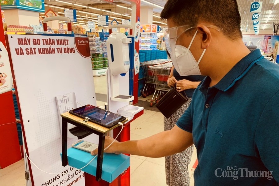 | Ngoài có thẻ mua hàng QR Code, người dân khi vào mua hàng tại siêu thị sẽ được đo thân nhiệt và sát khuẩn tay tự động, hạn chế tiếp xúc trực tiếp |