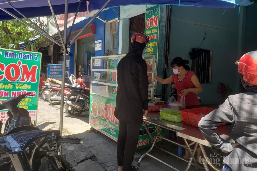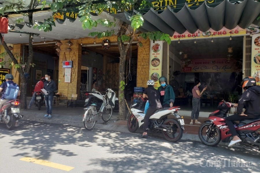 | Các cửa hàng bán đồ ăn tại "phố ẩm thực" Đặng Dung (Liên Chiểu) đã mở bán trở lại. Nhân viên các cửa hàng sẽ đưa thực đơn ra cửa để khách lựa chọn và đợi nhận hàng, hạn chế tiếp xúc trực tiếp |