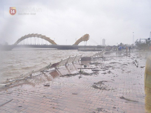 CôngThương - Hình ảnh đáng sợ tại bờ sông Hàn, Đà Nẵng, phía xa là cầu Rồng. Nước đã mấp mé bờ. Gió quật nát hàng rào ngăn cách ở bờ sông.