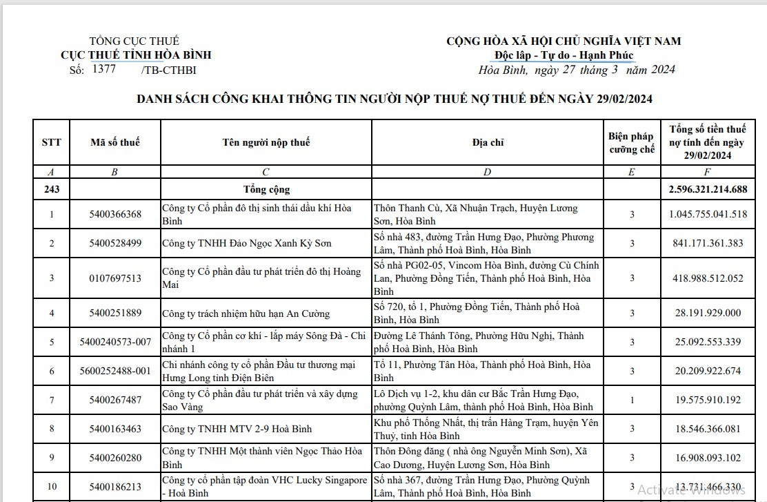 Cụ thể, ngày 27/3/2024, Cục Thuế tỉnh Hòa Bình ra Thông báo số 1377/TB-CTHBI về việc công khai danh sách thông tin người nộp thuế nợ thuế đến ngày 29/02/2024, trong đó có 243 doanh nghiệp với số tiền nợ thuế hơn 2.596 tỷ đồng.