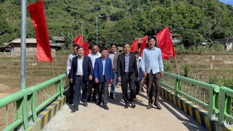 Lãnh đạo Công ty Cổ phần Nhựa Tiền Phong cùng lãnh đạo UBND huyện Đà Bắc, UBND xã Nánh Nghê kiểm tra cầu bản Mọc